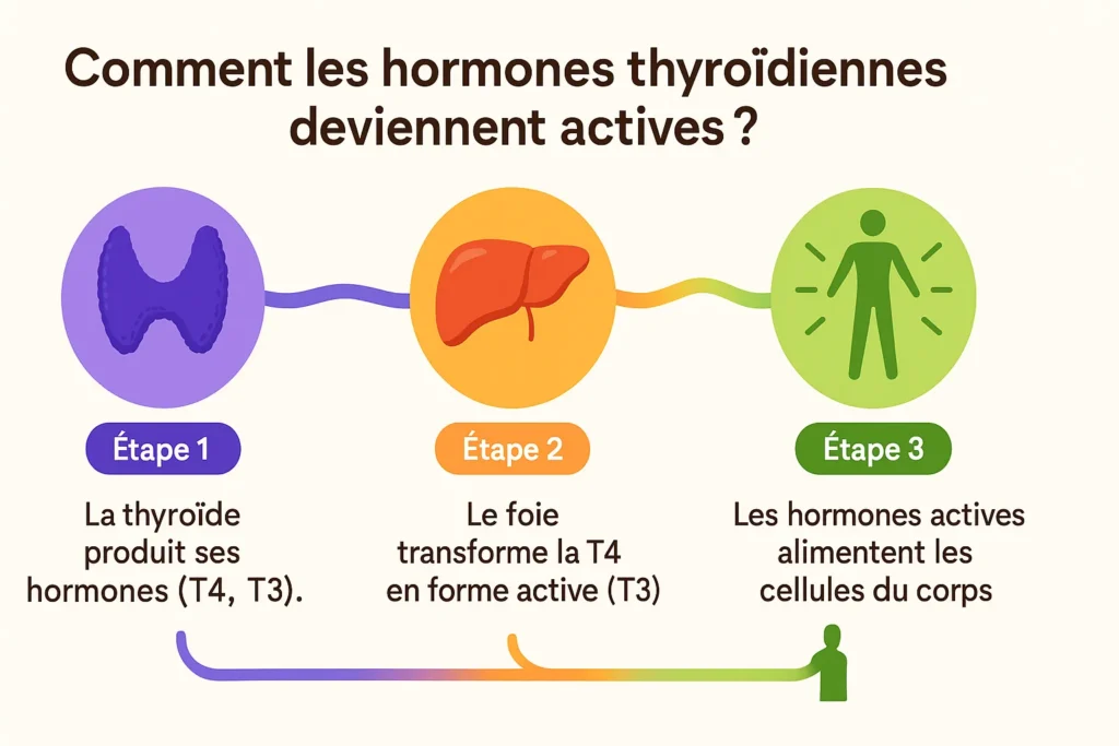 Cette T4 est comme une “matière première” : elle circule dans mon corps, mais elle est inactive. Pour que mon métabolisme fonctionne vraiment, il faut que la T4 soit transformée en T3, la forme active que mes cellules peuvent utiliser pour brûler de l’énergie, réguler l’eau et me donner de la vitalité.