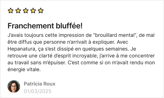 💬 “J’étais épuisée en permanence… Après 1 mois avec Hépanatura, j’ai senti un vrai regain d’énergie. Et le matin, mon visage n’était plus bouffi comme avant.” – Claire, 45 ans.